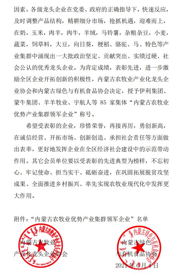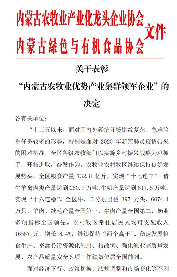 關(guān)于表彰“內(nèi)蒙古農(nóng)牧業(yè)優(yōu)勢(shì)產(chǎn)業(yè)集群領(lǐng)軍企業(yè)”的決定