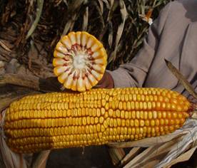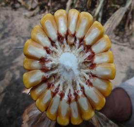 春播區(qū)從出苗至成熟126天左右。株型緊湊,株高271-286cm,穗位96cm。穗行數(shù)16-18 行,紅軸,果穗整齊、均勻;出籽率高達90%,軸細、粒深;長勢整齊一致,不空桿,產 量年度間差異小,穩(wěn)產性好。